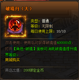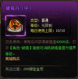 点击获取破境值可以打开获取破境值界面,等级达到81级及以上才可以消耗等级进行兑换,每天只能兑换3次,达到上限无法再兑换;也可以在商城或快捷购买界面购买破境丹获得破境值,每种破境丹只能使用10次,达到上限就无法再使用。
