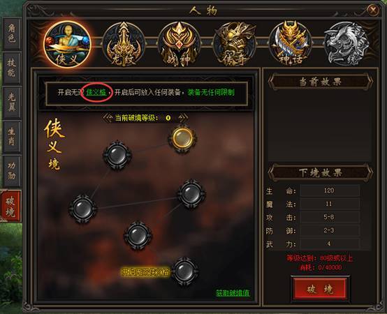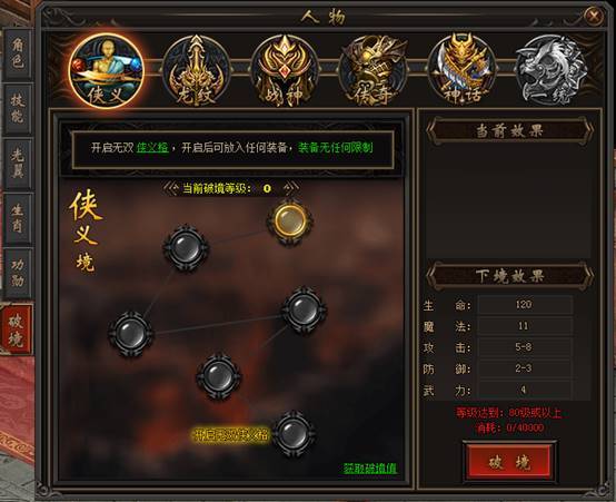 破境等级共有6层,侠义境,龙纹境,战神境,传奇境,神话境,一统境。