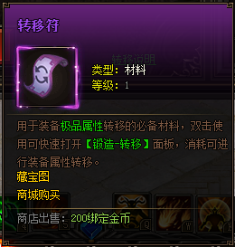 属性转移需要消耗材料转移符,转移符可以通过商城购买或藏宝图掉落获得,主线地图随机刷新盗宝贼,击杀之后有几率掉落藏宝图,使用藏宝图可以挖掘神秘宝藏。