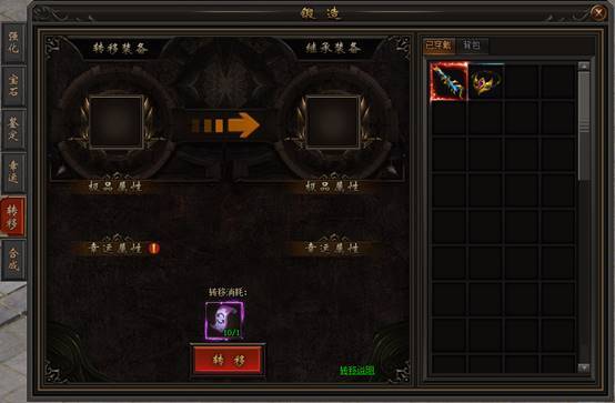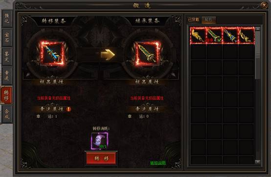 属性转移可以将一件装备的极品属性转移到另外一件装备上,如果是武器或项链含有幸运属性,只保留幸运属性的最高值和其对应的+3、+4额外属性。